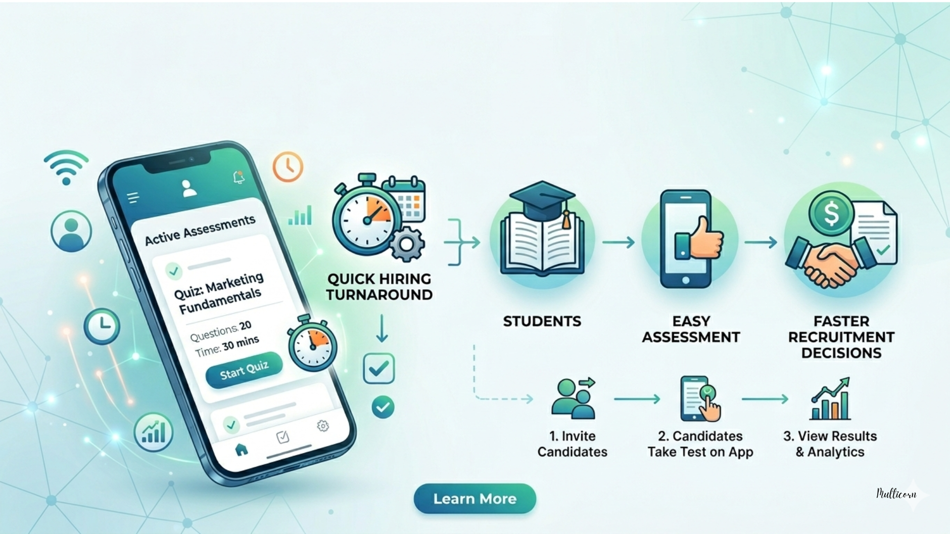 Students can take assessments easily through mobile apps with one-click access, enabling faster evaluation and recruitment decisions.