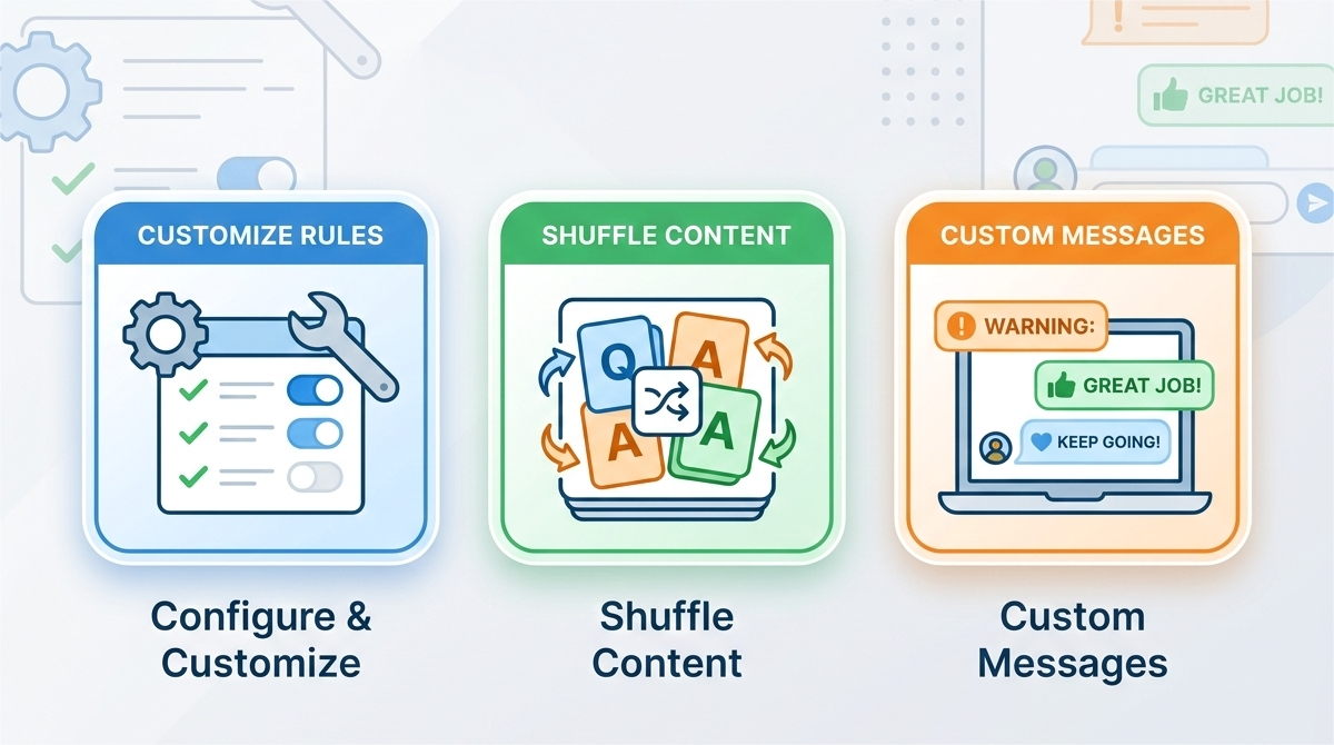 Customize proctoring rules, shuffle questions and options, and send custom messages such as warnings, improvements, or encouragement during the assessment.