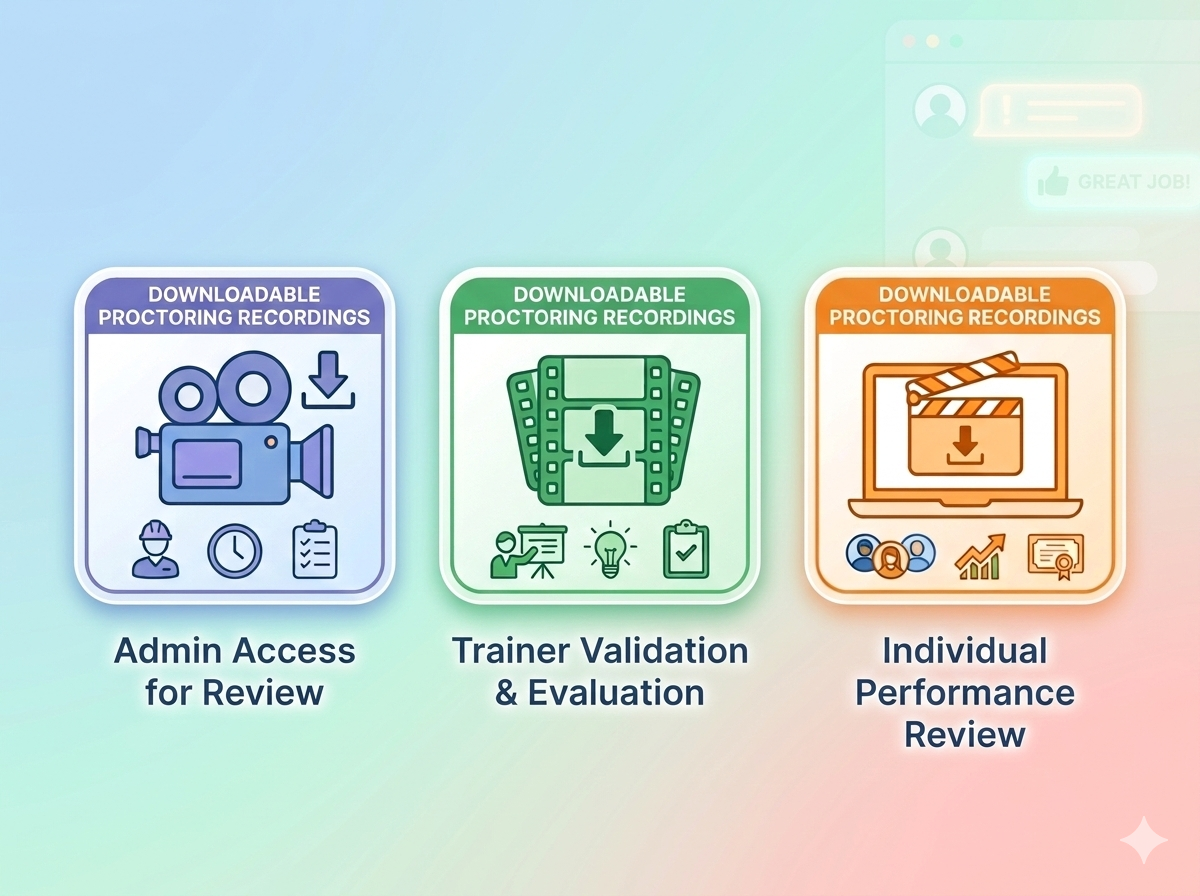Admins and trainers can access downloadable proctoring videos for review, validation, and performance evaluation purposes.
